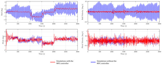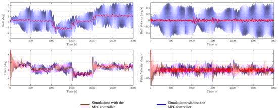 The time domain simulation results of the platform roll and pitch angles along with the roll and pitch velocities are depicted in Figure 12. Similar to Section 4.3, two scenarios have been conducted (i.e., with and without the MPC controller). Based on the results of Figure 12, it can be concluded that although the platform oscillations have increased (compared to Section 4.3) due to the rough sea conditions, the MPC has still managed to keep the roll and pitch angles within their permissible limits. In addition, without the MPC, the platform oscillations were substantial which jeopardizes structural integrity. It is also important to note that the attenuation of the pitching oscillations is not easy to achieve as the wave amplitude increases. Indeed, the worst case is considered here since the direction of the waves is purely perpendicular to the platform pitch rotation axis. For larger waves, manipulating only the thrust force using the three control inputs to decrease these oscillations might not be sufficient, as the hydrodynamic forces increase substantially compared to the aerodynamic forces used by the MPC controller to regulate the turbine.