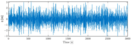 In this section, the previous scenario will be again repeated but with a more severe sea state condition which could arise due to the effects of storm events or climate change (i.e., with a significant wave height and a peak spectral period ) [45,46,47]. Only the simulation results related to the platform roll and pitch along with its roll and pitch velocities will be shown here since comparable simulation results as the previous scenario was obtained. The time series of the wave elevation is shown in Figure 11.