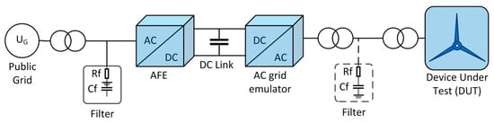 Grid emulators comprising a back-to-back converter system replicate the electrical grid at the nacelle test benches. The first converter, referred to as the active front end (AFE), is connected to the power grid via a transformer. It controls the DC link voltage. The second converter, called the AC grid emulator, simulates realistic dynamic and steady-state grid conditions by acting as a controlled voltage source. The device under test (DUT) is connected to this converter via a transformer [8]. To reproduce realistic grid conditions, the grid emulators have in addition to the voltage control an impedance emulator [16]. Figure 2 shows the general setup of a grid emulator to which a wind turbine is connected as a DUT. The AFE has a filter to avoid stressing the voltage in the upstream grid. A filter may be installed on the side of the AC grid emulator to ensure voltage quality at the emulated connection point of the DUT. However, there are also configurations that use advanced voltage control algorithms to be able to omit a filter [7].