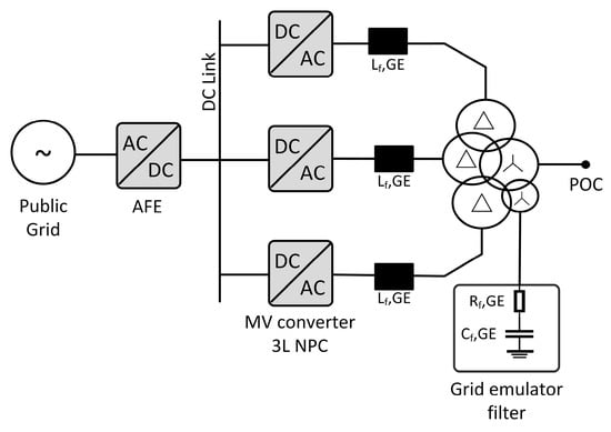 In order to validate the interactions of the individual components with each other in advance, new test procedures have emerged in recent years. These include virtual testing, which examines the interactions of the individual components in advance [2], and system test benches, on which the complete nacelle is tested in advance under laboratory conditions [3]. These were first described by Jansen [4,5]. One of the goals of these procedures is to reproduce real field behavior on the system test benches, also called nacelle test benches, to make them usable for certification [1,6,7]. For this purpose, emulator systems reproduce both the behavior of the rotor on the test bench and an artificial grid connection [8]. The grid emulators on the system test benches consist of several parallel converter systems connected via the under-voltage winding of a transformer [7,9]. The transformer raises the voltage to the required level [7,9,10]. Grid emulators are required to have dynamics that satisfy the requirements of the Under Voltage Ride Through (UVRT) tests [11]. At the same time, the required tests on power system responses demand consistent high voltage quality [12]. To meet these two requirements, advanced control algorithms have been developed, such as feed-forward control [9], interleaved switching of the converters [13], and modulators with optimized pulse patterns [7].
