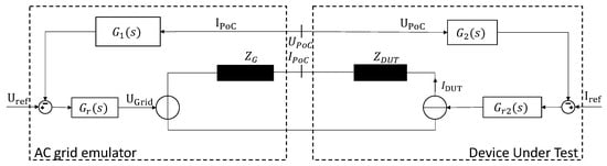 Figure 4 represents a highly simplified illustration of the control relationship as it exists on the test bench. The wind turbine as DUT is shown as the current source, and the grid emulator is the voltage source. Both the grid emulator and the DUT perform a control function related to the PoC. Due to this linkage, there is a direct influence between the grid emulator and the DUT. The transfer functions G1(s) and G2(s) correspond to the calculation of the grid impedance of the grid emulator and the power calculation of the wind turbine, respectively. The controlled system results from the real impedance ZG on the grid emulator side and the impedance of the wind turbine ZDUT on the DUT side. Both impedances are mainly determined by their respectively connected transformers.