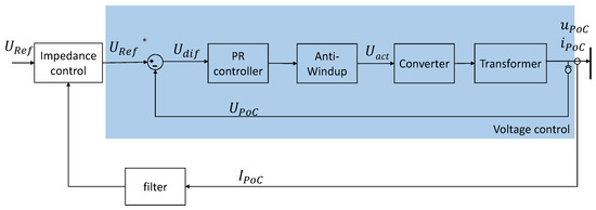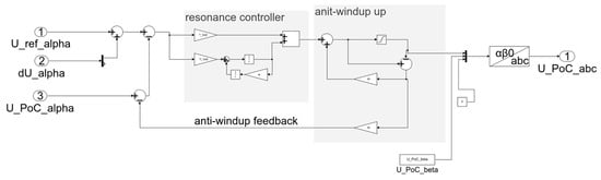 The set point of the reference voltage URef* results from the preset voltage and the voltage correction due to the impedance control (see Section 3.2). To represent both three-phase symmetrical and two-phase asymmetrical voltage dips, the control is implemented in alpha–beta coordinates. It offers the advantage of two separately controllable coordinates and facilitates the control of the three-phase grid. The structure of the control of both coordinates is identical. As a disadvantage, the alpha–beta transformation still deals with sinusoidal variables. To be able to follow the changing set point, a proportional and resonance controller (PR) is used. PR controllers, as shown in Figure 6, follow oscillating input variables without a remaining controller deviation. In addition, the control of individual, defined harmonics is possible [22].