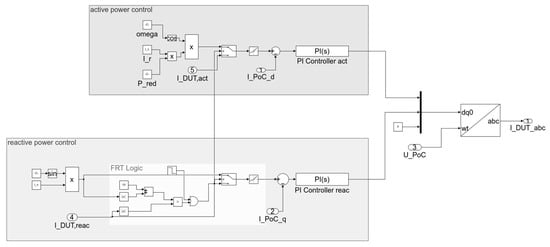 The current control enables the compliance with the power specification. Wind turbines are classically controlled in dq-coordinates, which allow direct determination of the active and reactive power [28]. A phase-locked loop (PLL) is used to calculate the dq coordinates from the measured current. The control of the two components is done independently based on a pre-sampled reference value. In the UVRT case, the reference value is calculated as described previously. In steady state mode, the reference value is a predefined parameter. For real wind turbines, this results from the available wind power and the reactive power feed-in specified by the grid operator. The selection of the reference value first requires information about the current operating mode. In the simulation, the level of reactive current is the decisive criterion to define the mode. If the required reactive current is higher than the reactive current injection specified in the steady-state operating mode, it indicates a UVRT case, and hence, protection mode is enabled. Figure 9 shows the control mode of the DUT current controller.