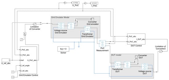 During uninterrupted grid operation, the transformer of the grid emulator increases the voltage to 20 . At the same time, it represents the controlled system. The PoC voltage is subsequently fed back to the controller [21].