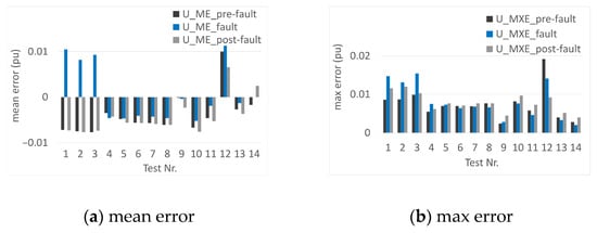 This result is confirmed in Figure 12. Figure 12a presents the mean error of the three ranges for all tests. This is always less than one percent. The maximum error, shown in Figure 12b, is also below one percent in 10 of 14 measurements. Only the three tests with a 0% voltage and the full-load test with 0.73% fault voltage are between 1 and 2 percent deviation [21].