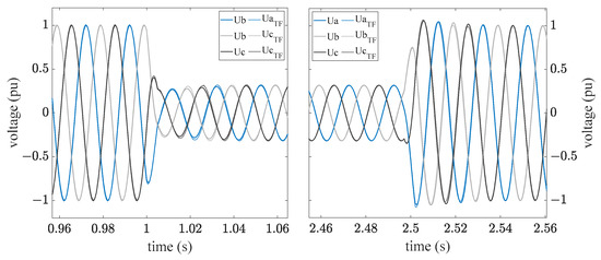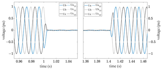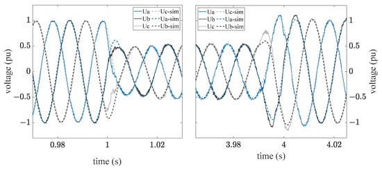 The established standards and technical guidelines prescribe the evaluation of the positive sequence system component. The comparison between measured data and simulation result was carried out for the pre-fault, fault, and post-fault areas, as can be seen in Figure 11. The two transient areas of no relevance in the validation are also indicated. The measured and simulated voltages indicate high agreement before and after the error. The deviation in these ranges is always less than 1%, which is negligible considering the measurement accuracy [21].