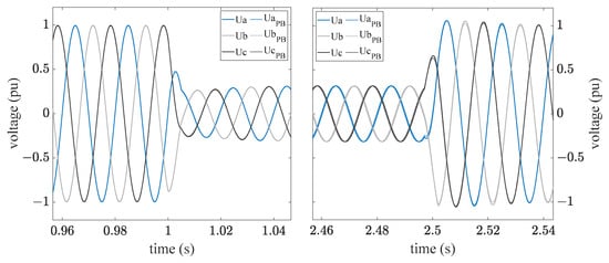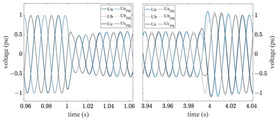 The previous evaluation refers exclusively to simulations in which the wind turbine model is replaced by real measured data. The control of the wind turbine itself has not yet been integrated into the simulation. Because the PoC is the reference point of the control for both the grid emulator and the wind turbine, it can have mutually strong influence on both. To further analyze the effects of this mutual influence, the validated simulation results of the playback variant were compared with simulations of a complete model. Figure 14 and Figure 15 are examples of the instantaneous voltages of a simulation in the playback (PB) variant and a simulation with the complete model of the wind turbine. Figure 14 shows a full-load test to a resulting voltage of 0.25 pu, and Figure 15 presents a partial-load test with 0.47 pu nominal voltage.
