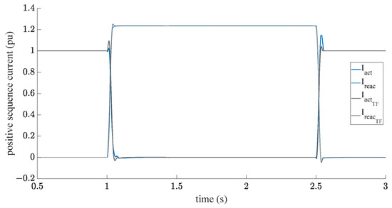 Figure 19, Figure 20, Figure 21 and Figure 22 exemplify the comparison of the full grid emulator model with the mapping of the grid emulator as a transfer function of the grid impedance replica. Figure 19 shows the instantaneous voltage for a voltage dip to 0 pu of the nominal voltage. The wind turbine is in partial-load operation. The two simulations’ results agree in all areas. During the voltage dip, the simulations’ results completely overlap even in the transient range. Only the active current has a slightly higher overshoot in the transient region in the model with the transfer function. Figure 20 presents the corresponding active and reactive current. Both the reactive and active positive-sequence currents have a high degree of agreement between the two grid emulator models. Only the transient region shows short-term deviations; however, these are outside the windows to be considered. The active current has a slightly higher overshoot during the voltage dip in the model with the transfer function. For the voltage recovery period, it is the other way around: here, the active current has a slightly higher overshoot in the complex model.