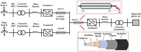 As depicted in Figure 1, a multi-terminal HVDC system connected to OWF A and OWF B is utilized to be the test case [34]. To obtain the desired voltage level, a converter transformer is installed adjacent to each OWF. The system is equipped with a high-pass filter and series reactor to remove current harmonics. The generated electric power is transferred through the HVDC system to the main networks. The VSC control unit can independently adjust the phase angle and magnitude of AC voltage. In this way, the DC power and voltage on the AC side can be adjusted by phase angle and magnitude of generated voltage by the VSC. In [35,36], the topologies of two-level and three-level VSCs were investigated in detail. It has been shown that these topologies have similar transient behavior in DC fault conditions [13]. The midpoints of DC capacitors are grounded to remove the imbalance between positive and negative poles [35,36,37]. The reference voltage is also provided in bipolar HVDC systems. The cable sheath is grounded so that the fault current can return through the sheath, the grounded midpoint of the capacitor and the grounded link of the transformer [13]. However, with a suitable control strategy, the MMC could be more tolerable to DC faults.