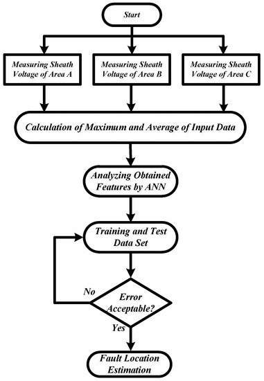 In this study, it is assumed that the fault detection process has been performed and a faulty branch identified. This can be achieved by detecting sudden changes in the magnitude of DC current and voltage in the related area. The faulty branch can also be diagnosed using the state of the DC circuit breaker of each area [7,8]. The open state of a DC circuit breaker means that a DC fault happened in that area. The algorithm to train and test the proposed method is shown in Figure 2. At first, the proposed method collects signals of sheath voltage measured at the HVDC cable terminals of three areas. Then, the calculation process of two features—the maximum absolute value and the average of sampled data—will be started. The proposed method will be trained by these features to achieve acceptable outputs. Finally, the trained ANN is able to estimate the fault location in the faulted area.