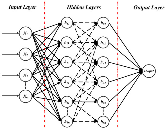 The ANN has the learning ability of exemplar patterns so that it can be used for both regression and classification purposes. This network consists of several layers: input, hidden, and output. Each layer has several neurons, and its output is considered as the next-layer input after passing through activation function. The activation function can be linear, hyperbolic, and tangential. The layers’ connection is established through a weight matrix. In order to recognize the nonlinear and complicated relationship between input and output matrices, the bias vector and weight matrix should be determined so that the maximum estimation accuracy is obtained. To achieve this goal, the weight and bias are gradated in a repetitive process based on the gradient descent method. Assuming that the connecting weight between neuron i and j is wij and neuron bias is bi, then the output of the ith neuron is expressed as follows: