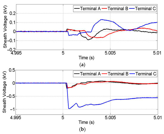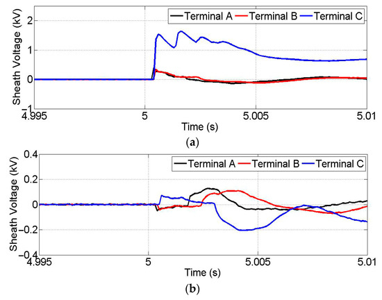 Signals of sheath voltage when the negative cable to ground fault happens at 95 km distance: (a) positive cable (b) negative cable.