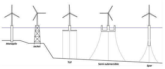 Figure 1). Fixed turbines are mounted on foundation elements that are installed onto the seabed. The most common foundation, called monopile foundations, is utilized for water depths of 0 to 30 m. For deeper regions, there are more economic fixed options—such as tripod and jacket foundations—but none are usually viable for depths over 50 m. For these scenarios, Floating Wind Turbines (FOWTs) are better suited [