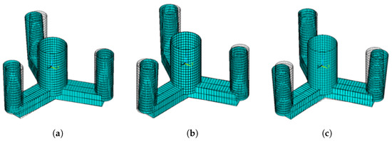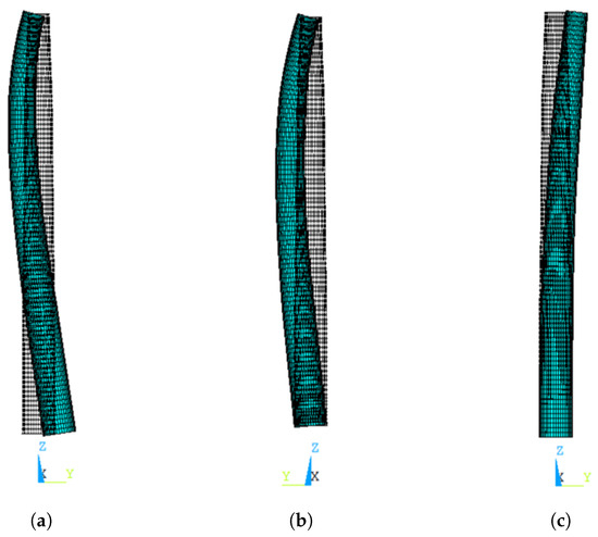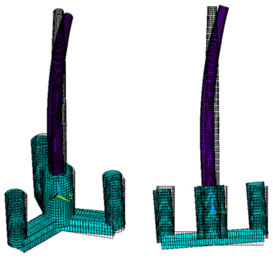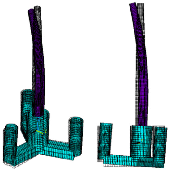 ® (Version 4.9), the first two modes of vibration were obtained, and their respective natural frequencies were compared to the ones from a shell model developed in an in-house FE software. The first mode was shown to be a side–side tower bending mode coupled with platform rotation in the same plane. The second was a fore–aft tower bending mode coupled, again, with platform rotation in the same plane.