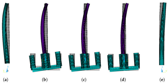 ®. Various tower configurations were studied: clamped at the bottom, connected by a transitional piece to the floating platform’s fixed central column, and connected to a free platform in air and in water. The results showed that for floating turbines—just like fixed turbines—simply considering the tower clamped at the bottom results in unsatisfactory results. The transitional piece between the tower and the floater’s central column was shown to importantly reduce the natural frequency and the free–free tower + floater model resulted in a significantly higher frequency that was decreased with the consideration of added mass, which was simply modeled as an increase in mass and rotational inertia. It was also shown that hydro-static stiffness had little influence on the tower first natural frequencies.