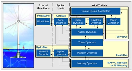 FAST includes a number of modules that use mathematical models to simulate one or more turbine components, such as AeroDyn (aerodynamics), HydroDyn (hydrodynamics of platforms for offshore structures), ServoDyn (control and electrical systems), and BeamDyn or ElastoDyn (structural dynamics). The schematic of various modules available in FAST is depicted in Figure 2. The time-domain simulation and investigation of coupled nonlinear aerohydroservoelastic simulation of onshore or offshore wind turbines on the fixed-bottom or floating substructure is made possible by the assembly of these modules.