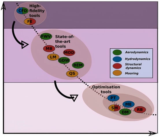 In recent years, a large variety of simulation tools have been developed to examine various structural dynamic, aerodynamic, wind-inflow, and mooring models of wind turbines in the time-domain, as well as to anticipate and assess their response. Fields related to FOWTs have recently received substantial research attention because of the potential benefits of these systems over onshore systems. Waves, sea currents, hydrodynamics, and mooring systems have all been modelled to replicate the additional physical phenomena involved with offshore wind turbines. The various components of offshore wind turbine modelling tools are depicted in Figure 1.