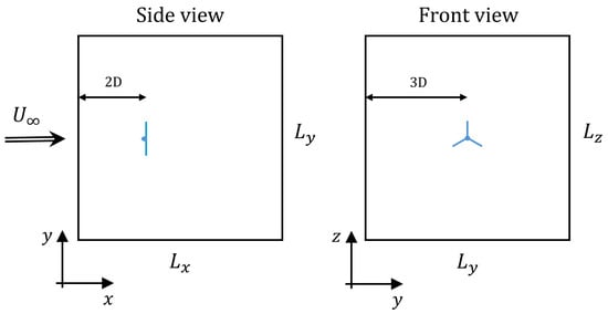 At the inlet boundary, a Dirichlet condition is imposed, prescribing a steady and uniform inflow velocity of 8 m/s. The outlet boundary condition is treated as a pressure outlet, allowing the flow to exit the domain freely while maintaining a zero-gradient condition for the streamwise velocity. This boundary is located at a sufficient distance (8R) from the rotor to ensure a minimal influence on the blade loading. Periodic boundary conditions are implemented in the vertical (y) and spanwise (z) directions. In addition, the effects of the nacelle and tower on the flow are neglected.