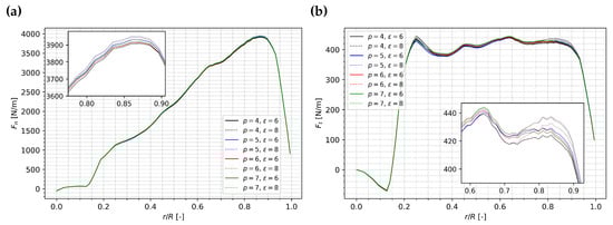 Figure 3 illustrates the distribution of the normal forces () and tangential () forces per blade span along the normalized radial positions () of the rotor blade, where  represents the radial position and  denotes the radius of the blade. The plot highlights the effects of varying polynomial orders (p) and the smearing factors () on the distribution of forces.