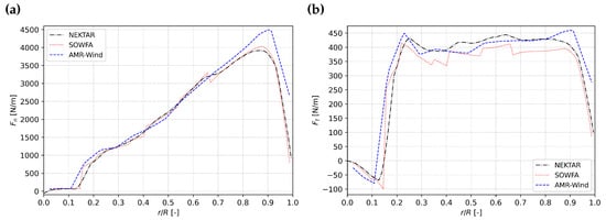 Comparison of different simulation tools for the (a) normal and (b) tangential forces per blade span along the rotor blades.