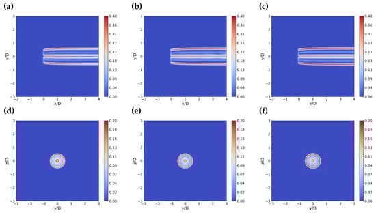 Figure 5 displays the time-averaged velocity fields at hub height in the horizontal () plane (Figure 5a–c) and the vertical () plane at the rotor plane (Figure 5d–f). All three simulations demonstrate a similar turbine wake downstream of the rotor, characterized by a velocity deficit directly behind the rotor and higher velocities at the wake edges. Although slight differences in wake width are observed among the tools, these differences remain within an acceptable range.