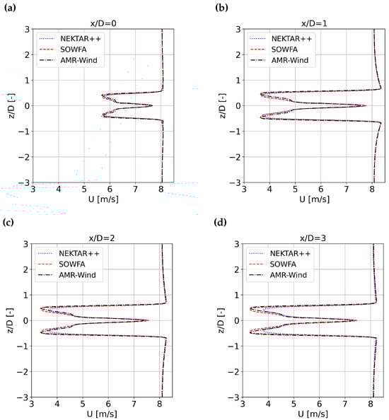 Figure 7 presents the time-averaged streamwise velocity (U) profiles plotted against the normalized vertical coordinate () at four distinct streamwise locations ( = 0, 1, 2, and 3). Here, D represents the turbine diameter, while x and z denote the axial and vertical directions, respectively. Each subplot provides a comparison between the results from Nektar++ (with  and ), SOWFA, and AMR-Wind.