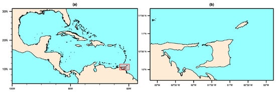 Maps of (a) Caribbean small island states and (b) the case study area, Trinidad and Tobago. In (a), Trinidad and Tobago is denoted by a transparent red box in the lower right segment of the map.