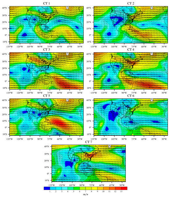 Atmospheric circulation types (CTs) in the Caribbean (indicated by wind-field arrows), and the corresponding mean wind speeds (as colored contours) [].