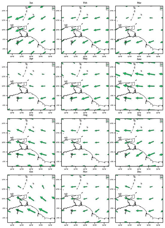 Representative monthly atmospheric circulation patterns (green arrows) (and wind classes) for CT 1 over a smaller region of the Caribbean. The legend’s vector length corresponds to 2.5 m s−1.