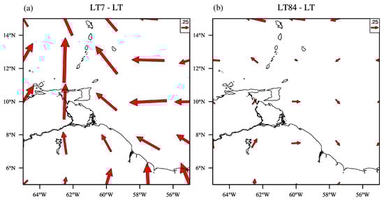 In Figure 6a, the difference between the derived long-term field created with seven wind classes (LT7) and the actual long-term mean (LT) is depicted, while in Figure 6b, the difference between the derived long-term field created with eighty-two wind classes (LT82) and the actual long-term mean is shown. The vector error in using eighty-two wind classes is smaller than that if seven wind classes were used. The sum of all the vector component differences squared for LT82—LT (Figure 6b) (150.3 m2 s−2) is smaller than that for LT7—LT (Figure 6a) (398.8 m2 s−2). As such, eighty-two wind classes provide a more accurate representation of the long-term wind fields over the Caribbean than seven wind classes. Therefore, 82 wind classes were used in the subsequent steps of the SDD method.