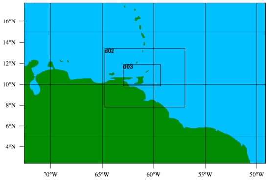The modeling domain consisted of two telescoping nests centered at 10.69° N and 61.47° W, with a Mercator projection. The outermost domain’s (D01’s) horizontal resolution was 25 km, with the first nest having a resolution of 5 km and the innermost nest having a 1 km resolution (Figure 7). The outermost domain (d01) consisted of 91 61 grid points, the first nest (d02) comprised 151 111 grid points, and the second nest (d03) spanned 331 196 grid points. WRF was configured with two-way communication between the nests and the parent domain. The highest-resolution grid encompassed Trinidad and Tobago and a part of Venezuela, on the South American continent (d03). The model was configured with thirty-four vertical levels, with the first six levels above ground at approximately 14 m, 42 m, 76 m, 117 m, 191 m, and 277 m. The wind maps were produced from the outputs of the d03 domain, which is the study region.