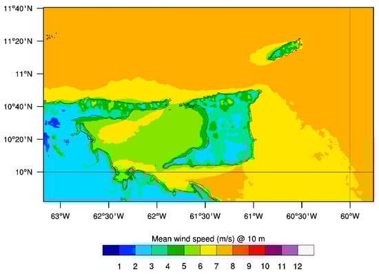 Wind speed map at 10 m AGL in and around Trinidad and Tobago.