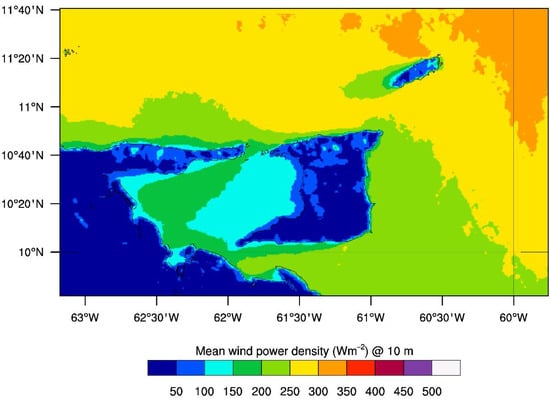 The validation is for 10 m maps, as wind data were obtained through the USA National Climatic Data Center’s website for the two sole long-term stations maintained by the Meteorological Service of Trinidad and Tobago. These two climatological stations record wind data at only 10 m above ground level (AGL) at Crown Point, Tobago (the smaller island) and Piarco, Trinidad (Table 2). Weather observations at climatological stations are collected according to World Meteorological Organization (WMO) standards []. Hourly wind data for the period 1 January 1989 to 31 December 2009 were used to validate the wind maps. The quality checks of the wind data are detailed in [].