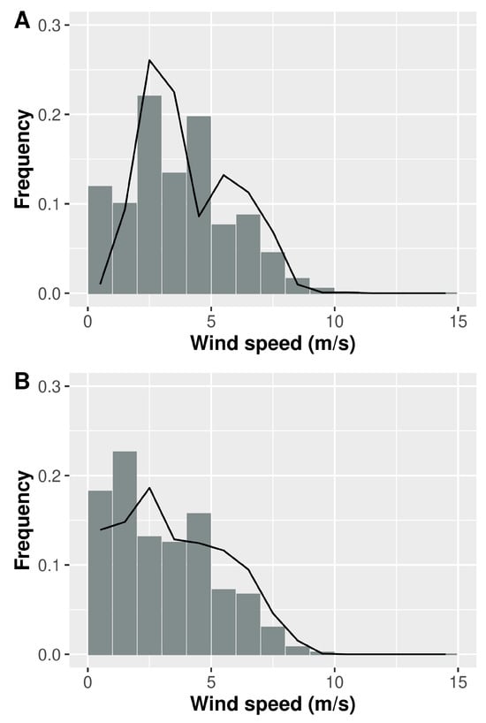 Histograms of 10 m level simulated wind speeds at the grid points closest to (A) Crown Point and (B) Piarco. The simulated pdf is represented by the black line, and the observed pdf is represented by the bar plots in each figure. The frequencies are represented as fractions.