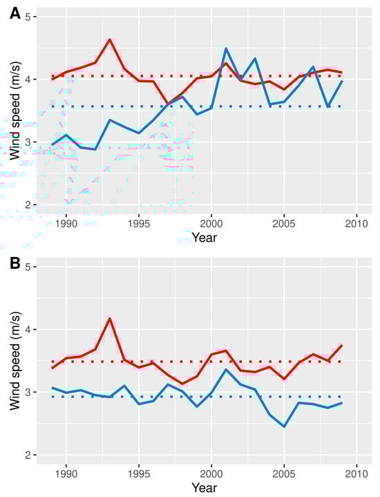 Interannual variability in annual 10 m level mean wind speeds. Simulated wind speeds are in red and in situ data are in blue lines. Simulated wind speeds were taken from the grid points closest to (A) Crown Point and (B) Piarco. The horizontal dotted lines indicate the corresponding long-term means.