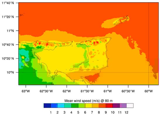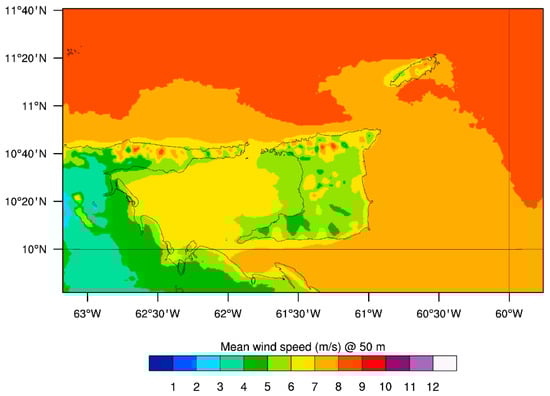 The comparisons of the simulated wind speeds and the observed wind speeds at the meteorological stations show relatively good agreement at the 10 m level. The in situ mean wind speeds at these sites were 3.56 m/s and 2.92 m/s, respectively []. The corresponding simulated long-term mean wind speeds from the 10 m wind map were taken as the wind speeds from the closest grid point to each station (Table 2). These were 4.02 m/s and 3.52 m/s at Crown Point and Piarco, respectively, resulting in a bias of +0.46 m/s and approximately 15% higher than the actual mean wind speed for Crown Point and +0.60 m/s, or about 18% higher than the mean wind speed, for Piarco. These positive biases show a tendency for the wind speeds to be overpredicted at the two low-lying measurement stations. The mean bias of +0.53 m/s, calculated herein, is only representative of low elevations and at the 10 m height. For these reasons, as well as that bias could vary with height, we do not correct the 50 m and 80 m wind maps (Section 3.2) for bias. Furthermore, at greater heights, where the wind speeds are more moderate, the bias could be smaller, as the NWP model configuration is known to not capture low wind speeds adequately []. In addition, some bias is expected, as differences exist between the model’s grid cell surface characteristics (e.g., mean elevation) and those at the measurement stations, and the bias obtained in this study is comparable with those obtained in other regions, such as the eastern Mediterranean Basin []. The simulated wind speed probability density distributions, when weighted, produced wind power densities (WPDs) of 63.4 W m−2 at Crown Point and 54.3 W m−2 at Piarco and a difference of 9.4–12.9 W m−2 (an average of 11.2 W m−2) compared to the corresponding actual WPDs of 56.0 W m−2 and 41.4 W m−2.