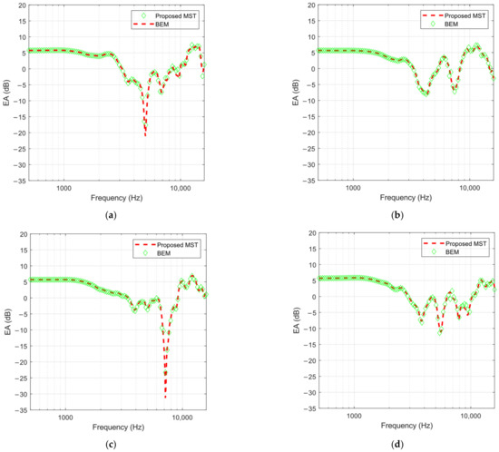 Excess attenuation plots from boundary element method and proposed multiple scattering theory. (a) Hemisphere distribution 1. (b) Hemisphere distribution 17. (c) Hemisphere distribution 15. (d) Hemisphere distribution 28.