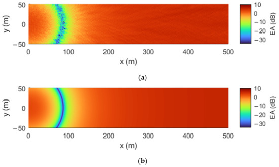 Excess attenuation calculated over an array of receivers at height of 1.70 m, for a rough ground at octave band frequency 500 Hz. (a) For a rough ground surface. (b) For a perfectly reflecting flat ground surface.
