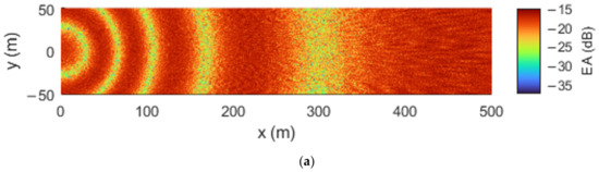Conversely, in Figure 6, there are some major differences between the results from the flat ground and the rough ground. The ground interference dips, which are caused by destructive interference between the direct and reflected waves, are destroyed. This is not a novel result and is understood in the context of sound propagation over roughness. An interesting result is that the excess attenuation, in between the interference dips, highlights some significant reduction and amplification in sound pressure. Not including the ground interference dips, the excess attenuation at various points in the receiver plane at 125 Hz can differ from, but are not limited to, a range of ±3 dB. The same statement can be made for the 500 Hz case in Figure 7. Also, it is clear that, as the frequency increases, these patterns in the scattering effect become finer due, to some degree, to the decreased wavelength.