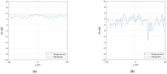 Excess attenuation calculated at a horizontal distance of 500 m from the wind turbine sound source. Excess attenuation is calculated over the strip of receivers over the y axis. (a) Excess attenuation at a frequency of 63 Hz at 500 m. (b) Excess attenuation at a frequency of 125 Hz at 500 m. The blue line indicates the results for the rough ground surface while the orange line indicates the results for the flat ground surface.