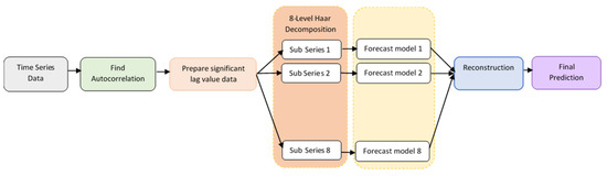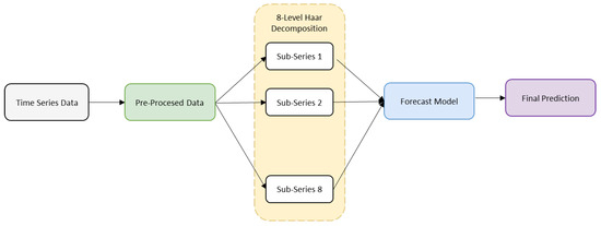 This approach decomposed the original signal into sub-series using 8-level Haar wavelet decomposition. These were then used as input features for a single forecasting model. The architecture of this model is presented in Figure 1.