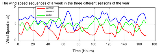 The wind energy for the month of January is displayed in Figure 4 and the frequency of speed plot is shown in Figure 5. Wind speed variations throughout a week in each of the four seasons, offering insights into the fluctuating nature of wind energy resources over different time periods, are shown in Figure 6.