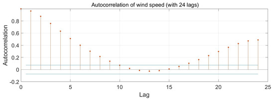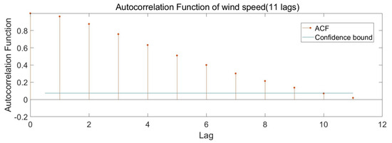 Autocorrelation functions (ACFs) with 24 lags and 11 lags are shown in Figure 7 and Figure 8, respectively. The ACF plots demonstrate that the lags t − 1 up to t − 11 have stronger relationships with the wind speed than the other lag periods. Additionally, the other lags are close to the confidence level for the interval. Hence, the data could be prepared with the last 11 data points.