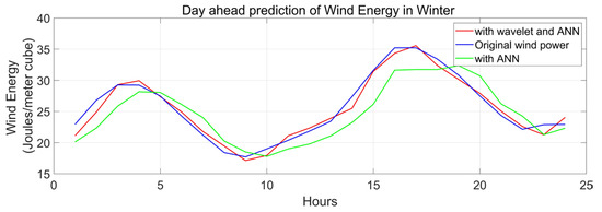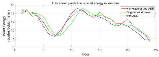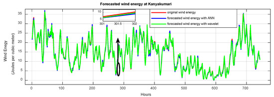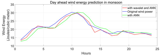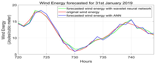 The forecasted wind energy with proposed model 2 for the month of January is shown in Figure 12, and the prediction for 31 January is shown in Figure 13. It was compared with the ANN model without wavelet decomposition. The MSE values for the day-ahead prediction and 3 h prediction are presented in Table 2. The MSE obtained using proposed model 2 for 3 h prediction is less than those shown in [1,29]. The three-hour prediction graph is shown in Figure 14. Comparison of wavelet neural network and feedforward neural network with proposed model 1 is shown in Table 3 and Comparison of ANN model and proposed multiple-component-approach WNN is shown in Table 4.