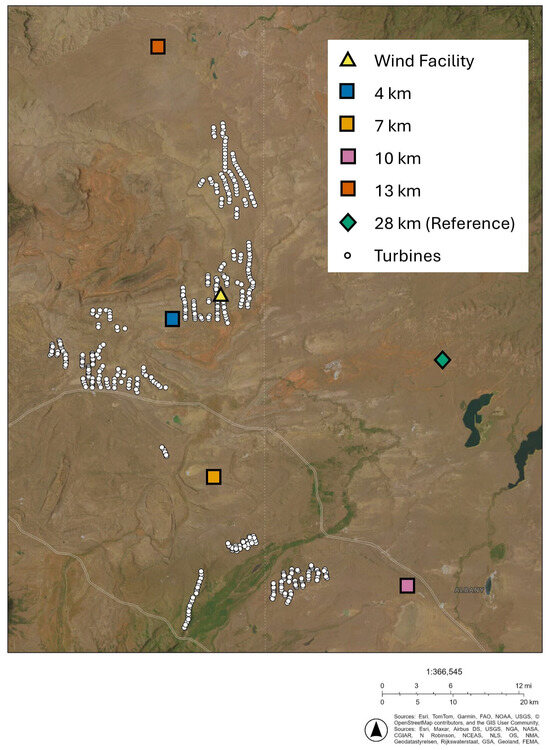 Locations of six sampling sites in southeastern Wyoming, U.S. The distances in the legend indicate how far each site was from the closest operating turbine. Turbine location data were provided by the US Wind Turbine Database. The basemap was accessed on 8 June 2025. Basemap source: Esri. The data for the basemap were provided by Esri, TomTom, Garmin, SafeGraph, FAO, METI/NASA, USGS, Bureau of Land Management, EPA, NPS, and USFWS.
