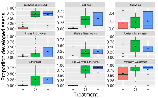 Excessive heat and drought conditions may help explain some of our seed-set results, as these phenomena affect flower development and reproduction in plants. For example, Himalayan Balsam (Impatiens glandulifera) responded to dry conditions by reducing the number of flowers produced and the duration of flowering [70]. Dry conditions also accelerated the phenology of crops [71]. Purple Chinese Houses (Collinsia heterophylla) had smaller flowers, less pollen, and low pollen viability in heat-stressed conditions [72]. We did not assess flower development or pollen in our study, so the degree to which drought and heat stress may have altered these variables is unknown; however, we hypothesize that water and temperature stress may have altered seed set. Our study occurred during unusually hot conditions compared to the average, which may have influenced the perennial species. Plants tend to self-pollinate more frequently during drought compared to cross-pollination [72,73]. Two species in our study, Milkvetch and Western Wallflower, showed no difference in seed development among the treatments. The proportions of cross-pollination and seed development in these species may have been inhibited due to drought stress, as was measured for Rapeseed (Brassica napus) during a drought [74]. Unfortunately, we were not able to measure seed set for our plant species during a wetter year for comparison. Continued studies during varying climate situations would provide more data to interpret the low seed set of these species. Future climate predictions suggest less water availability in North America [75], which may have crucial implications for plants and pollinators [76].