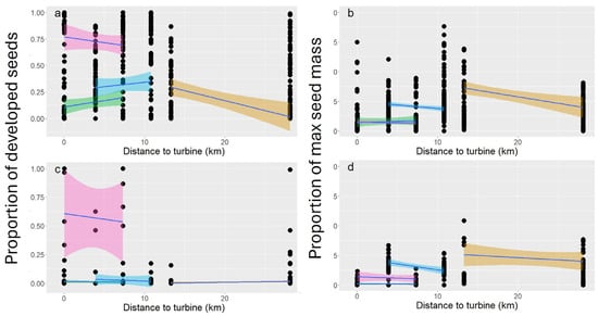 The proportion of developed seeds (a,c) and the proportion of maximum seed mass ((b,d) mean seed mass/maximum seed mass for a species) generally decreased with distance from an active wind facility. The data for all seed-set treatments (bagged, open-, and hand-pollinated) are shown in (a,b), and the results from the bagged treatment are shown in (c,d). Points represent the value for each treatment by plant and each color of line connect a plant species measured at two sites. The error around the lines represents 95% confidence intervals.