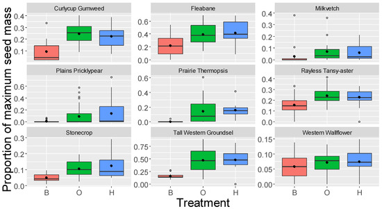 The proportion of maximum seed mass (mean seed mass/maximum seed mass) was lowest in the bagged treatment (B), where pollinators could not access flowers, suggesting that a low proportion of seeds could be produced through self-pollination. None of the plants were pollen-limited, as evidenced by the lack of difference between the open- (O; pollinated by local insects) and hand-pollinated treatments (H; excess pollen added). The bold line is the median, the black circle is the mean, the lower and upper limits of the box are the 25th and 75th percentiles, the whiskers are the minimum and maximum values, excluding outliers, and the open circles are outlier values.