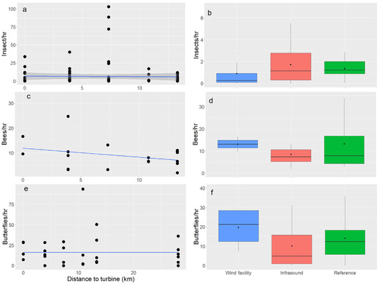 (a,b) The abundance of insects captured in vane traps, (c,d) the bees along the target-netting transects, and (e,f) the butterflies along the walking transects. (a) Insect and (c) bee abundances decreased with distance from turbines, excluding the reference site at 28 km, but butterfly abundance did not differ. (b) Insect abundance in the vane traps was lowest within the wind facility, but (d) bee and (f) butterfly abundances were highest within the wind farm compared to the sites that 4–13 km away that had decreasing infrasound. The reference site was 28 km from the nearest turbine and likely had minimal infrasound. Each point (a,c,e) represent a sampling date and the line is the slope of the linear regression. The points in boxplots are the mean, the bold line is the median, the lower and upper edges of the box are the 25th and 75th percentiles, and whiskers represent the minimum and maximum values excluding outliers.