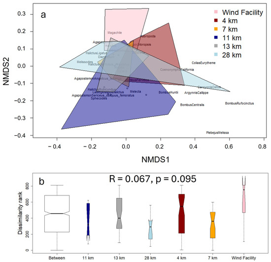 Non-metric multidimensional scaling analysis indicated that there was overlap in the pollinator assemblages at different distances from the turbines, and the wind facility itself had a rather unique assemblage (a). Analysis of similarity showed that the wind facility had the highest dissimilarity rank, and the site farthest away had the lowest rank (b). The bold line is the median, the lower and upper limits of the box are the 25th and 75th percentiles, and the whiskers are the minimum and maximum values, excluding outliers.